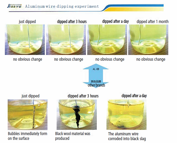 AL-88 flux is a RoHS-compliant, excellent lead-free environment-friendly aluminum wire flux used for the soldering between aluminum wires and copper wire. Withits strong wettability, soldered dots are bright and uniform after soldering, and less corrosion will be caused. It can quickly and effectively remove the oxide film on the aluminum surface, and reduce the tensile force of solder surface and enhance the wettability, and weld reliability so as to reach a perfect welding performence.